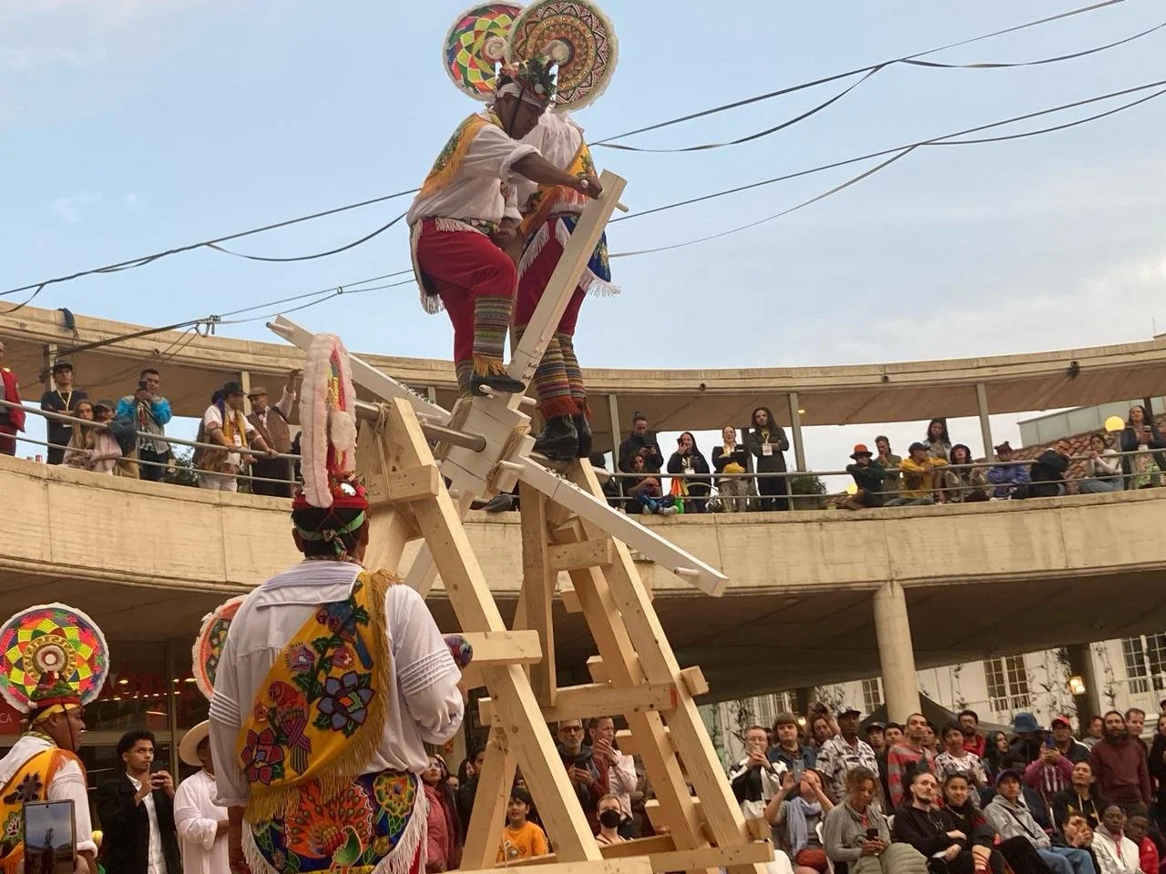 Ceremonia ritual Danza de los Guaguas, Voladores de Papantla (Veracruz, México). Encuentro Internacional de Circo y sus Saberes - Achura Karpa, Bogotá, 2024. (c) Artemotion. Photo: Nicolás Mahecha.