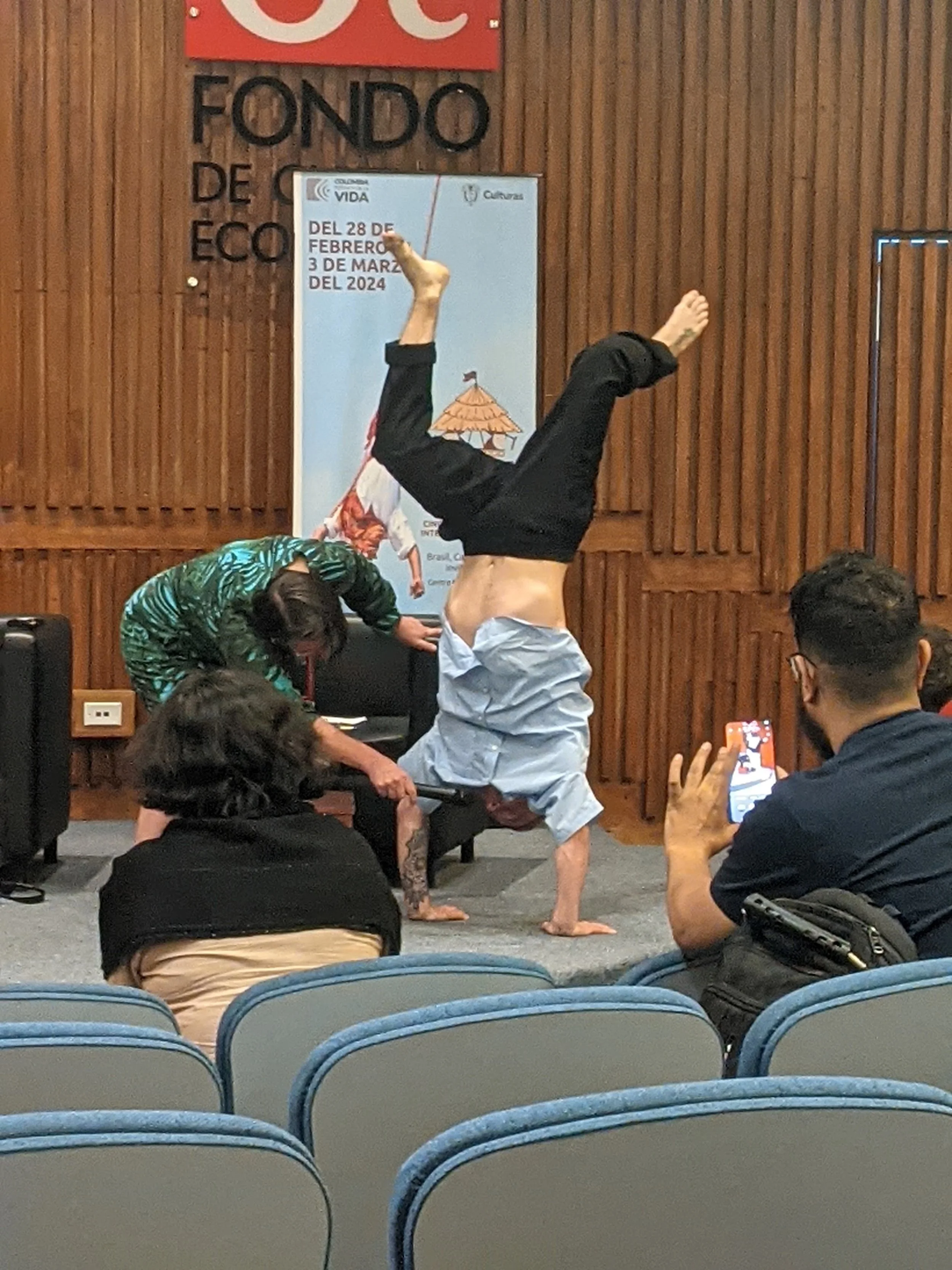 Circus artist and researcher Yann Szuter offering a presentation at the Circus and its Others IV conference, Bogotá, 2024, assisted by Karen Fricker. (c) Artemotion. Photo: Nicolás Mahecha.